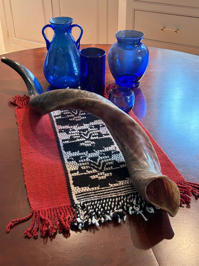 I would like to share a beautiful story about the meaning of the call of the shofar. The story is from <Chabad.org> and was adapted by Suzie Jacobson for her study sheet on <Sefaria.org> The photo above, taken by my wife, Middy in our dining room, is of a shofar that we bought in Sefat several years ago.